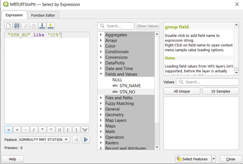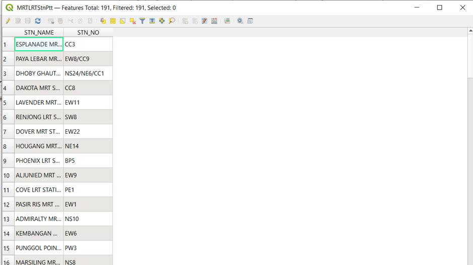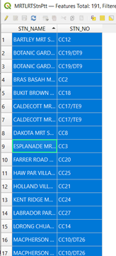 Do the same for the Downtown and East-West Line, replacing the ‘CC%’ with ‘DT%’ and ‘EW%’ and name the layers Downtown Line and East-West Line respectively.