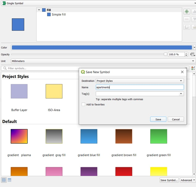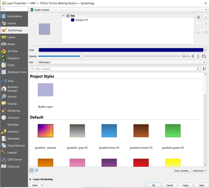 Using TE22A 15mins Walking Radius, right click on select Properties. Click on Symbology –> Change fill colour to #000080 –> Change Opacity to 30% –> Save Symbol and name it as a Buffer layer –> it should appear in Project Styles for east access.