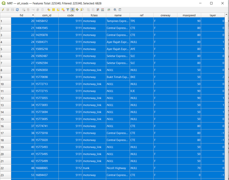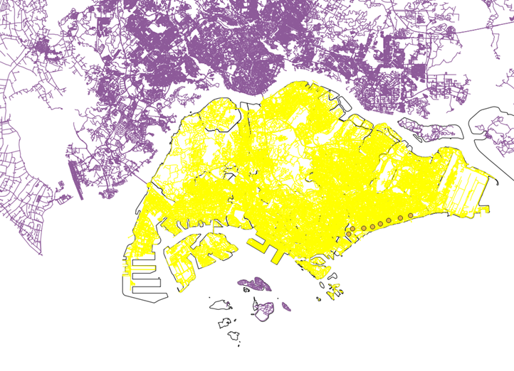 Add the OSM road layer in. Use ‘Select by polygon’ and select the area outlined by the MP19 Subzone layer, leaving out some of the SOuthern Islands, Pulau Ubin and Pulau Tekong.