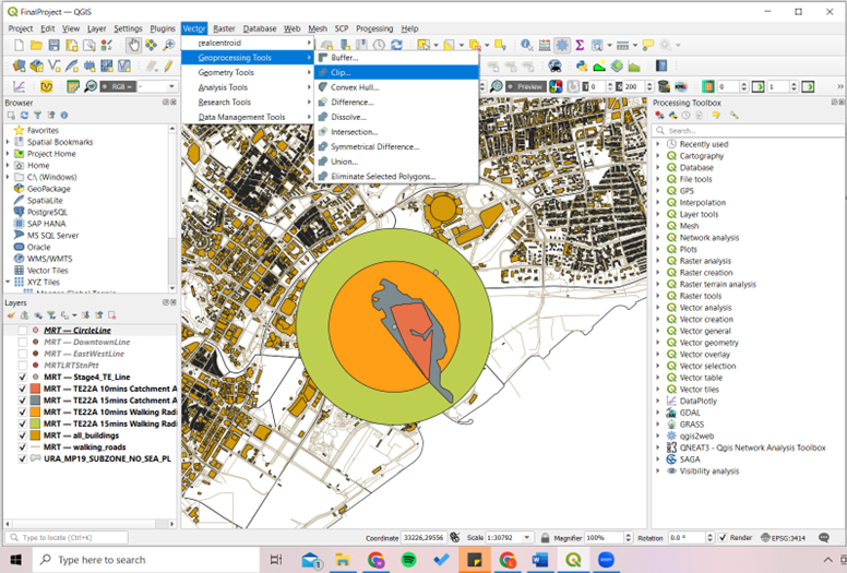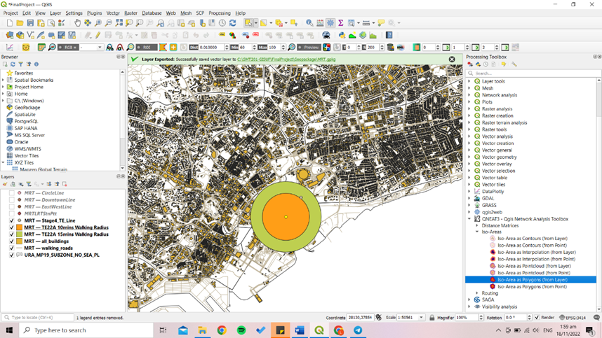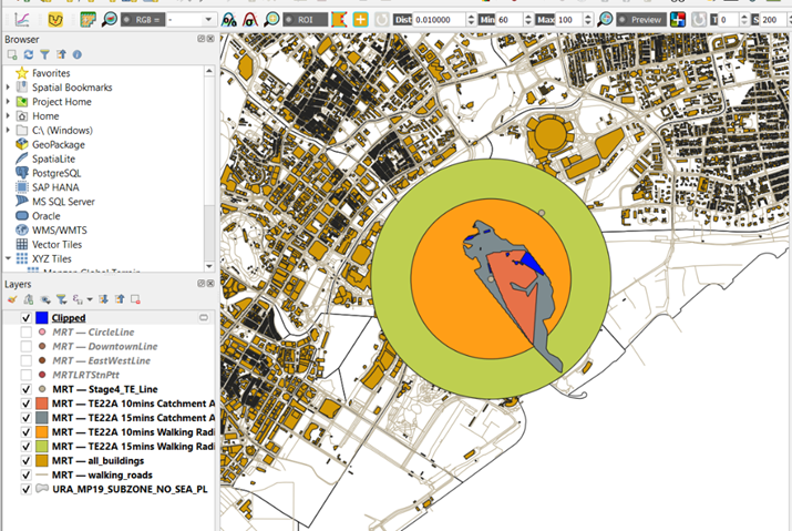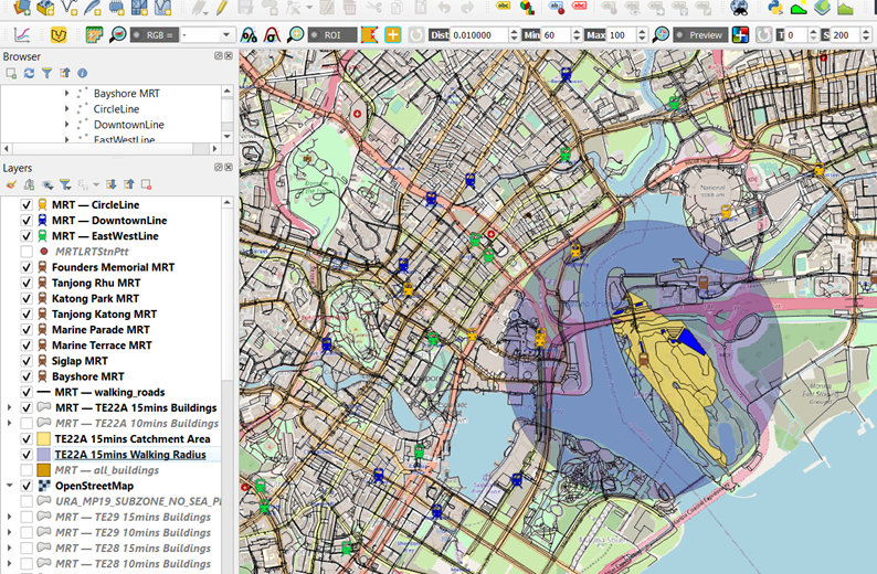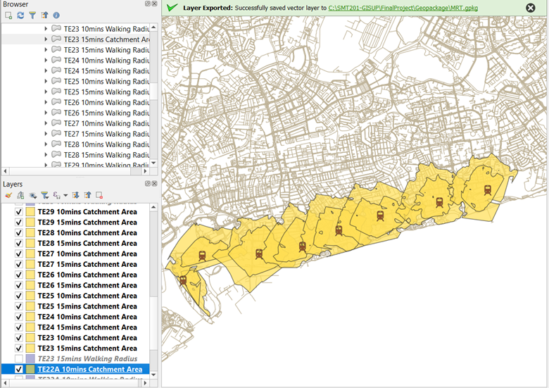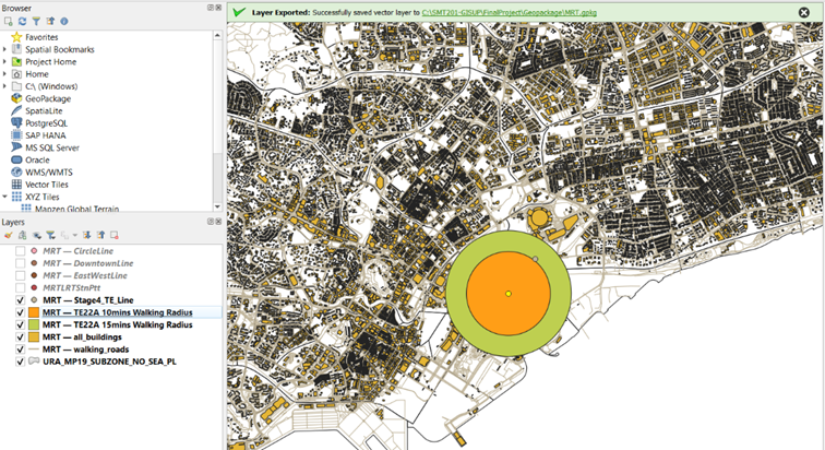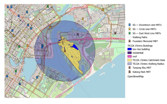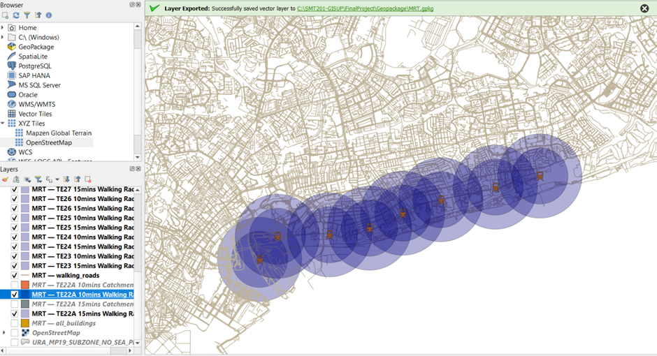 Using TE22A 15mins, activate and place the layers in the following order: the MRT stations and lines, walking_roads, TE22A 15mins Buildings, TE22A 15mins Catchment Area, TE22A 15mins Walking Radius, and Open Street Map, as show in the Layers Panel in the image below: