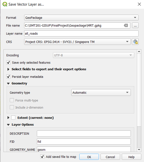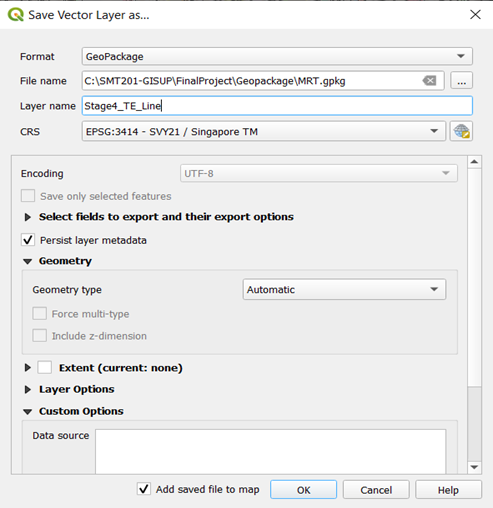 Save the layer as GeoPackage and name the layer Stage4_TE_Line, and the CRS as EPSG:3414 – SVY21.