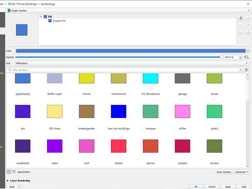 Building Type Colour Code apartments #477bce church #e1de21 commercial #beb956 construction #45e1c4 garage #6c6c6c house #9cf046 kindergarten #a27a50 low-rise building #0101ff mosque #55b987 public #42ce81 residential #4a2b84 roof #ea58ca school #ff3355 temple #c3154c terrace #6c8341 retail #9200f4 hut #501dcf office #ff85ed EiS-Residences #01f7ff service #d44f3b Using TE22A 15mins Building Layer, Right Click and Select Properties –> Select Symbology –> save the symbols for the type of buildings. Below is an example for apartments: