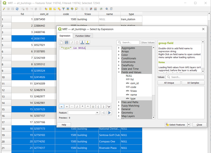 Right-click on all_buildings layer and select Open Attribute Table. Click on Select by Expression. Type in “type” is null in the expression box. Click on Select Features. This will select all building types that have null values.