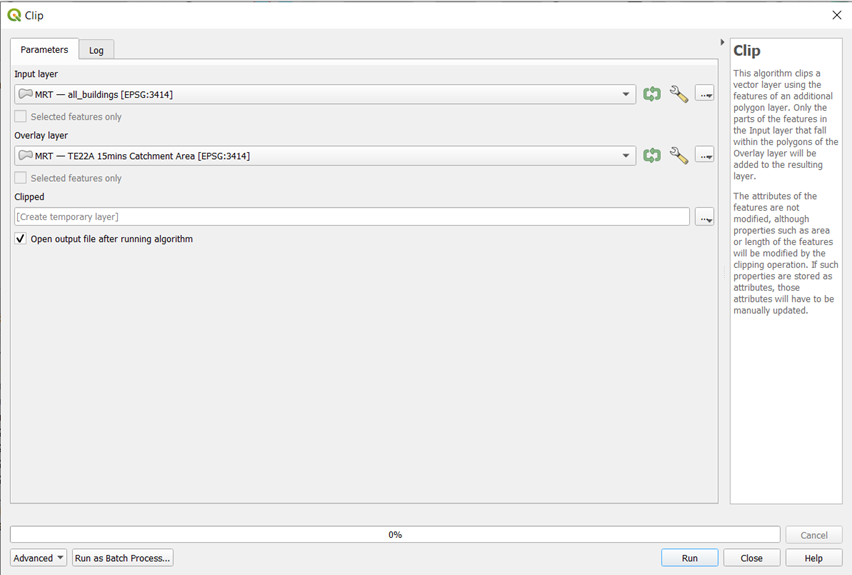 For 10min Catchment Area, repeat the same steps but replacing the Overlay layer with TE22A 10mins Catchment Area, and save to GeoPackage as TE22A 10mins Buildings.