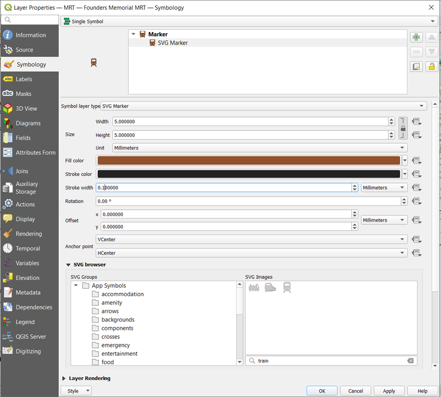 Click on Symbology –> Simple Marker –> Change the Symbol layer type to SVG Marker –> Search for ‘train’ at the search bar under SVG images –> double-click on the icon