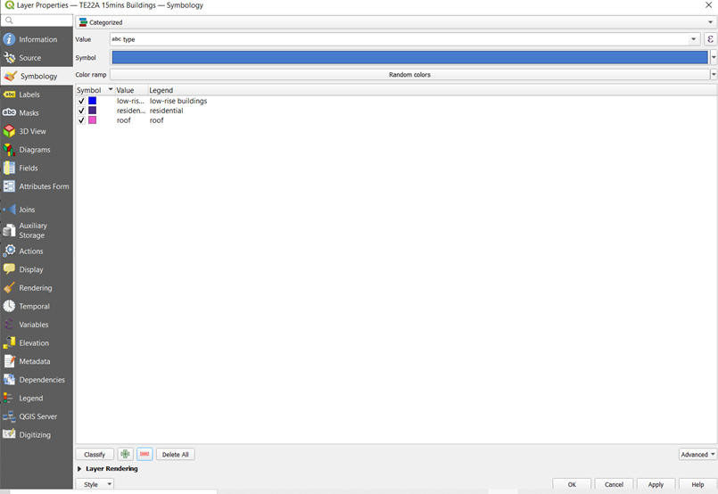 With the saved symbols, now select categorised symbols in the drop-down box at the top –> Under Value, select ‘type’ –> Click Classify –> Change the colours according to the saved symbols –> remove all other values.