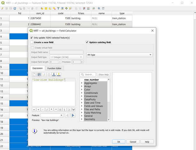 After selecting features, Open field calculator and update the values to ‘low-rise buildings’.