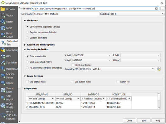 Select the TE Stage 4 MRT Stations.csv CSV file. Under the X and Y field, select Longitude and Latitude respectively. Leave Geometry CRS as WGS 84.