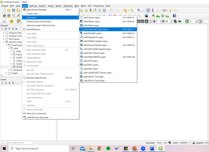 First go to ‘Add Layer’, then ‘Add Delimited Text Layer’.