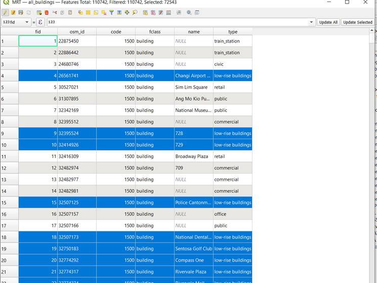 The all_buildings layer consists of several null values under the “type” column. After looking at Google Maps, there consists of different types of low-rise buildings, shophouses, etc. Thus, the team decided to replace the null values for “type” column with low-rise buildings.