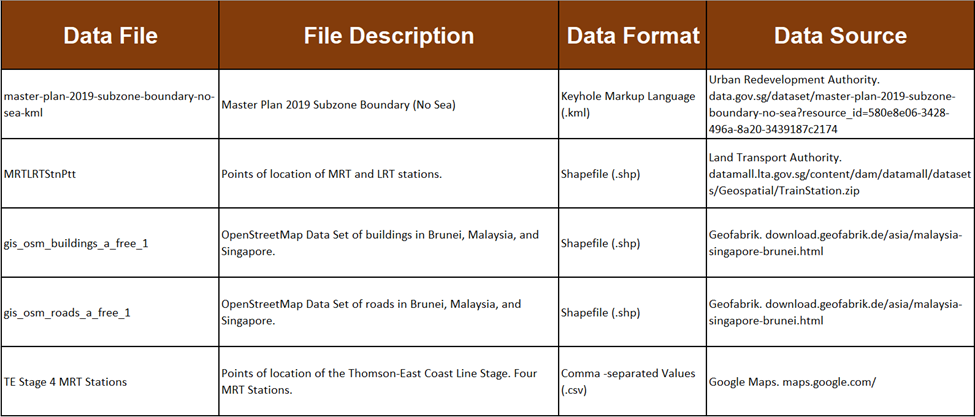 The data that we collected comes from 4 sources: Urban Redevelopment Authority (URA), Land Transport Authority (LTA), Geofabrik GmbH, and Google Maps.